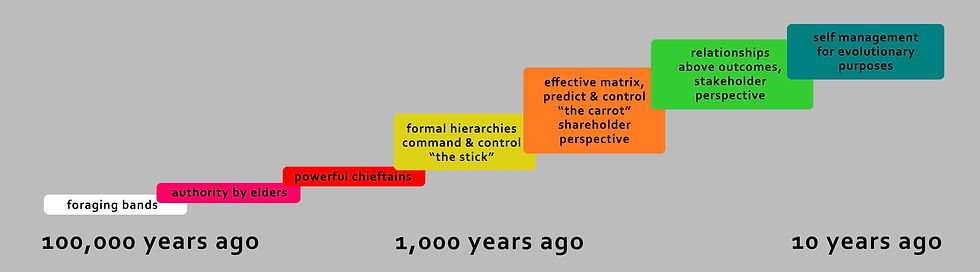 You can read all about it in a book titled “Reinventing Organizations: A Guide to Creating Organizations Inspired by the Next Stage of Human Consciousness”, by a management consultant named Frederic Laloux. An enthusiastic foreword is provided by Ken Wilber, a name that is likely to carry a lot of weight with some readers but not others, a point to which I will return. Laloux uses a case study approach to illustrate an advanced form of consciousness and social organization that he calls “Evolutionary”. He also calls it “Teal” in a color-coding scheme that is useful for contrasting with other stages of consciousness and social organization. If you are scientifically inclined and your Woo-Woo alarm bell is beginning to ring, bear with me.